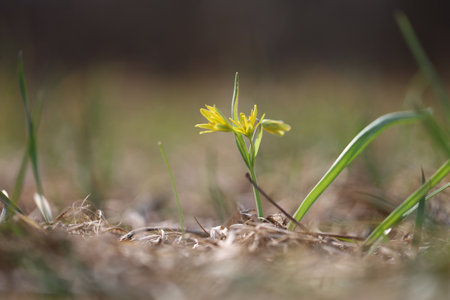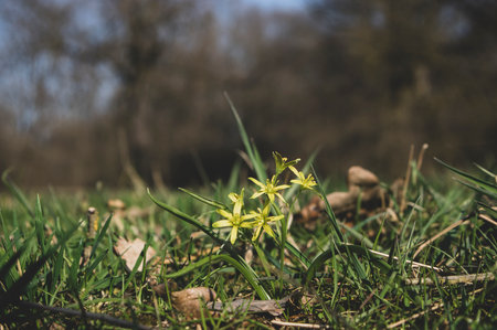 Field Gagea flowers (or Goose onion, or Bird's bow). Spring flowers in the forest. Selective focus, fine DOF (depth of field).