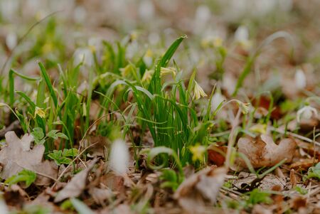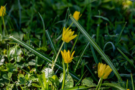 Yellow spring flowers among the green grass. Spring flowers in the woods