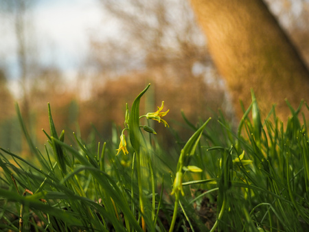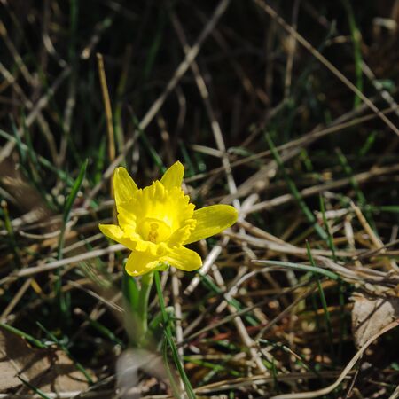 yellow flower, Narcissus pseudonarcissus, on a winter sunny day in the mountains