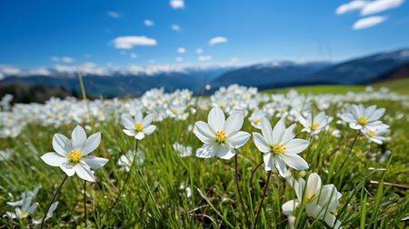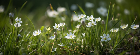 Flowers in a green grass on a sunny meadow. banner. AI generated content