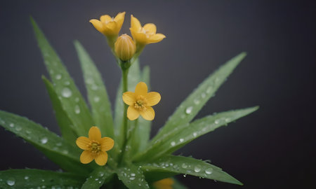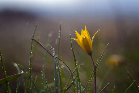 Small spring flower of Gagea lutea or goose onions close-up. Yellow Star-Of-Bethlehem, water drops