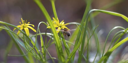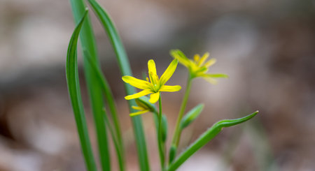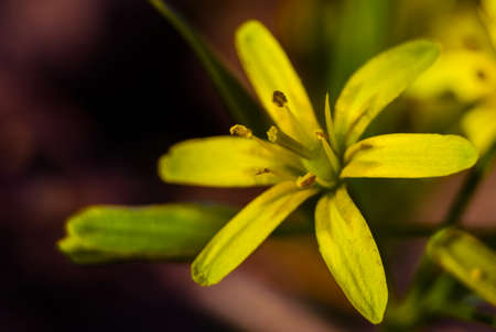 Gagea villosa or hairy star of bethlehem blooming in spring, wild plant flower, yellowe hairy gagea, beautiful landscape, selective focus and diffused brown background, Liliaceae at sunny day