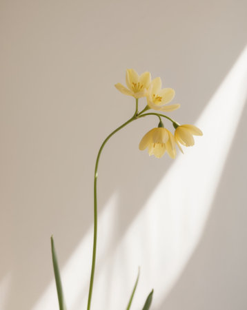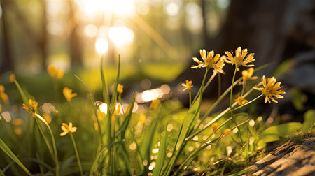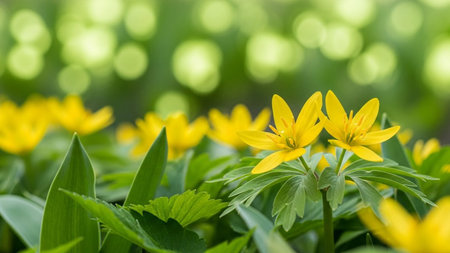 Delicate yellow flowers emerge from vibrant green leaves, creating a peaceful and refreshing atmosphere in a garden. Sunlight dances on the petals, enhancing their beauty during springtime.