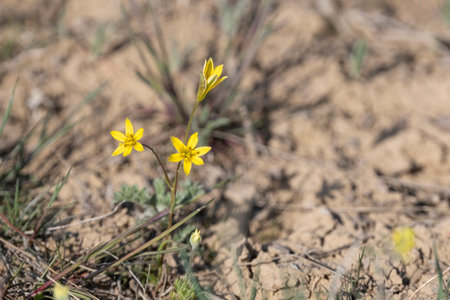 Goose onion, or Goosebow, or Gooseweed, or Geidzhia, or Bird's onion, Gagea In the desert soil of the earth, two small yellow spring flowers bloom,