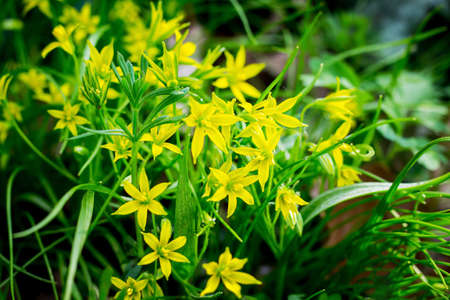 Goose onions flowers. Yellow snowdrop and Gagea lutea. Spring and summer preparation concept. Ecological and horticulture. Close-up. Green grass and selective focus. Wild plants.