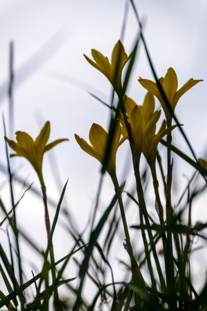 beautiful wild yellow tulips on the meadow On the Sunset. Tulipa quercetorum