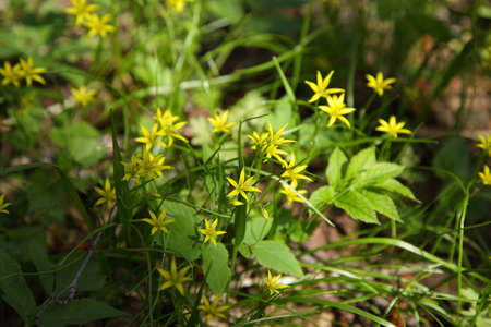 Yellow flowers of goose onion in spring forest. Background of little flowers, nature beautiful, Bright and soft flower background.