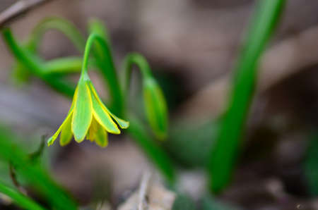 Gagea lutea yellow snowdrops spring flower on green bright background