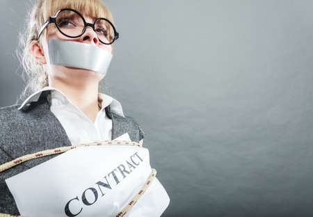 Afraid businesswoman bound by contract terms and conditions with mouth taped shut. Scared woman tied to chair become slave. Business and law concept.