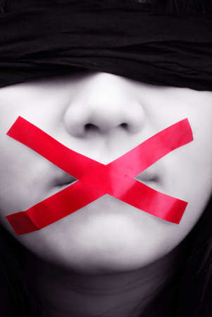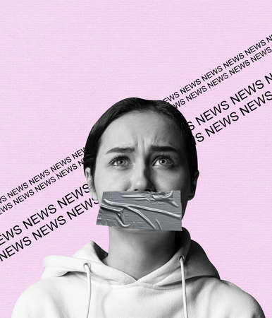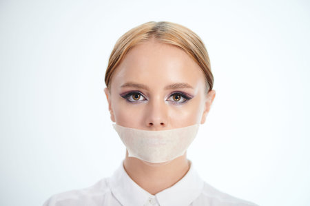 Woman with mouth sealed in adhesive tape. Free of speech, freedom of press, human rights and truth concept.