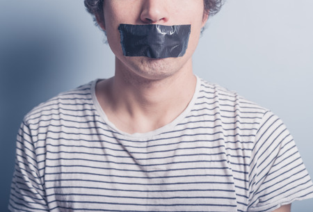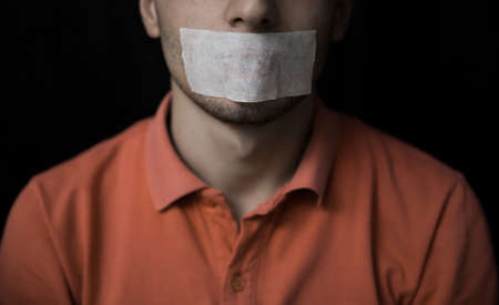 attractive young man with mouth sealed on duct tape to prevent him from speaking keeping him mute and censored in freedom of speech and expression concept