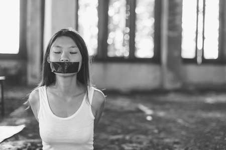 Women violence and abused concept. Stop domestic violence against women and human trafficking.Woman with tape on mouth and stop violence text
