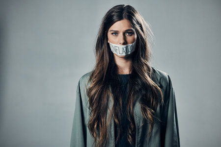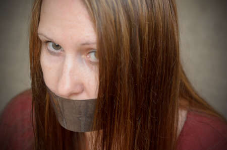 Scared woman with mouth taped shut. Afraid young girl with duct tape on lips. Censorship and freedom of speech concept.