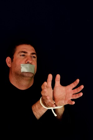 Missing kidnapped, abused, hostage, victim man with hands tied up with rope in emotional stress and pain, afraid, restricted, trapped, call for help, struggle, terrified, locked in a cage cell.