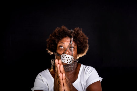 Portrait of a black woman in chains with an iron mask over her mouth. Slavery in Brazil. Studio reproduction.