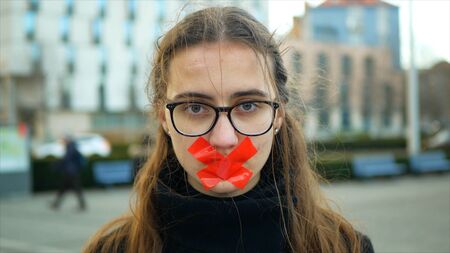 Irritated angry young woman with mouth covered with tape. Policy and human rights.