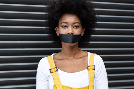 Portrait of mixed race woman having black tape on mouth. equal rights and justice protestors on demonstration march.