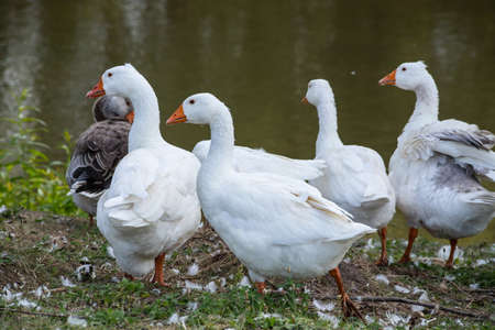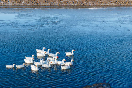 Domestic geese swim in the water. A flock of white beautiful geese in the river.
