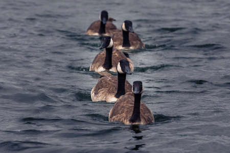 Five Canada Geese in the water all in a line. The second goose is the subject of focus