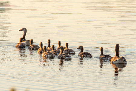 Greylag goose, Anser anser, couple with 11 chicks on a lake at sunset