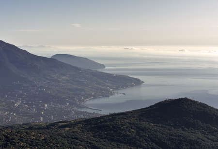 Early morning over the sea from the height of mount AI-Petri. Silvery clouds, Yalta, Ayu-Dag mountain below, coastline. Russia, Crimea