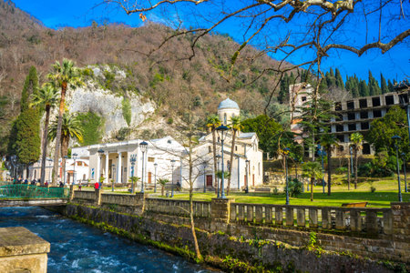Gagra, Abkhazia-October 11 2024 : Old historical building with columns among the mountains in the Republic of Abkhazia. Building of the Winter Theater in Gagra. Sunny autumn day