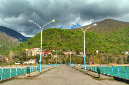 View of mountains from walkway on pier in Gagra, Abkhazia, HDR processing