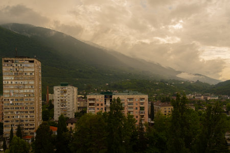 Residential buildings near the mountain against the background of fog and sunset