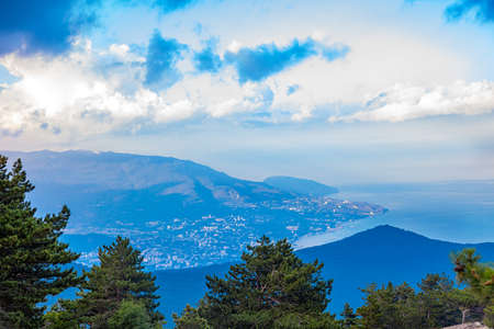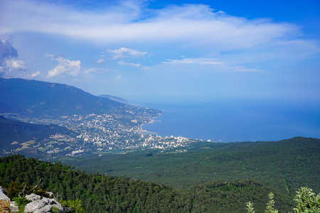 Picturesque view of the city of Yalta and the Black Sea from Ai Petri mountain in the Crimea.