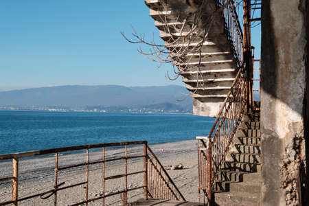 Abandoned metal structure, stair building on beautiful blue sea, awaiting demolition. environmental impact. Coastal law. financial crisis. Bankruptcy. bankrupt construction company. bright sun