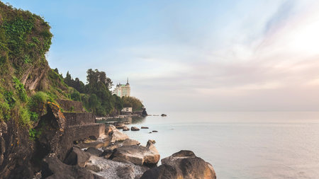 Rocky Black Sea coast with lush greenery, large boulders and modern hotel in the distance near Batumi, Georgia, concept of travel and nature