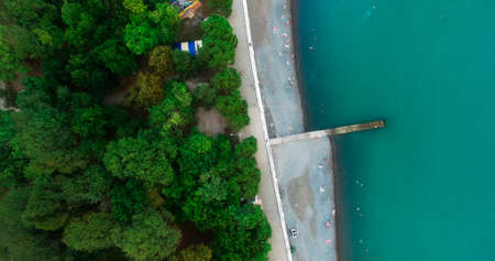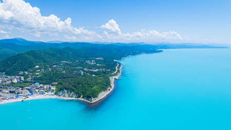 Amazing aerial view of Black Sea coast, turquoise color of the sea. Summer landscape with mountains, green forest, azure water, and blue sky in bright sunny day. Travel background. Top view.