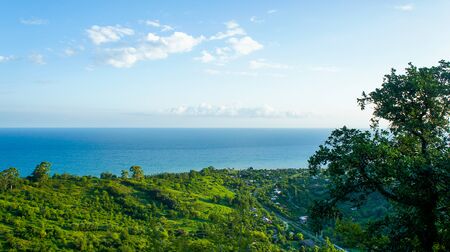 View of the green coast, water to the horizon under the morning sky. Sochi, Russia, 2021