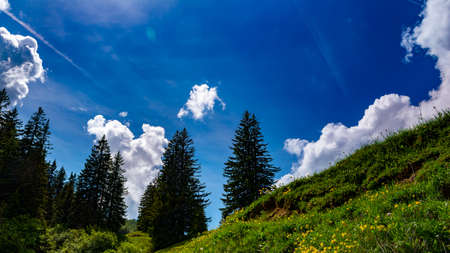 Kleinwalsertal mountains landscape panorama background - Mountain panorama in summer with blue sky and clouds
