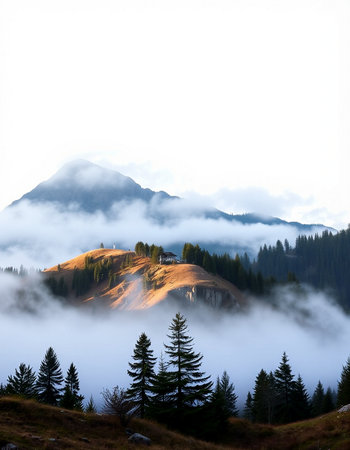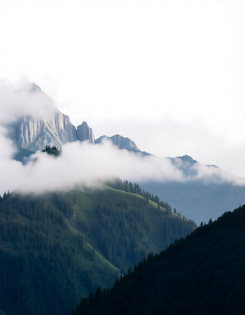 A misty morning in the mountains of Switzerland, with rolling hills and forests shrouded by fog, creating an ethereal atmosphere. The photograph captures the serene beauty of nature's tranquility. --ar 3:2 --v 6.1 Job ID: 7b93aa38-cba9-4afe-9609-19f108f7f677