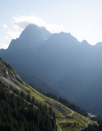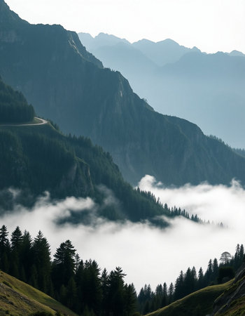 Winding asphalt road navigating through pine trees and fog, ascending towards a mountain peak. Winding mountain road leading to a foggy Alps peak
