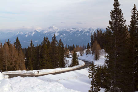 Beautiful Austrian scenery snowy road forest mountains Austria in winter
