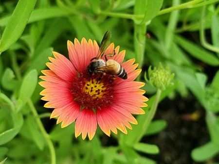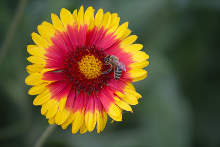 Bee pollinates a yellow-red Firewheel close-up. Nature