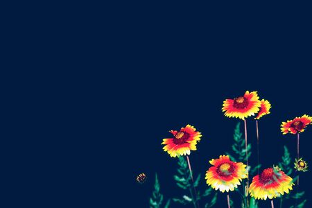 Close up of red and yellow flowers on dark blue background with copy space
