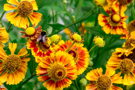 Blooming yellow and orange helenium flowers in the garden