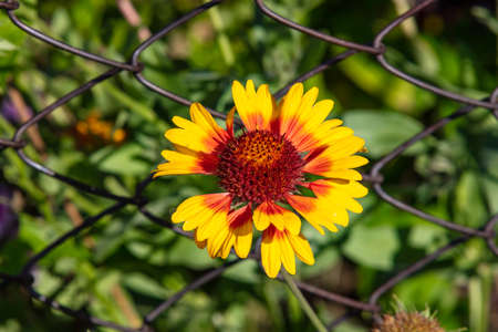 Close up shot of a beautiful yellow Gaillardia flower with a red center. Wired fence in the background. Blurred.