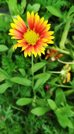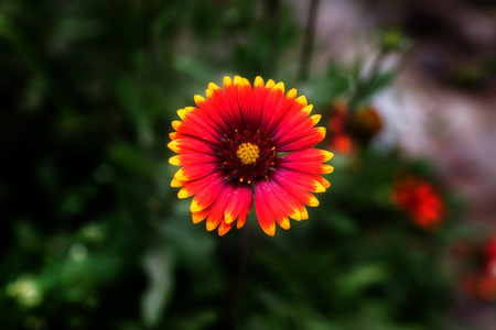 One sharp gaillardia flower on flowerbed. Bright colored, warm shades, with yellow border. Sunny summer day.