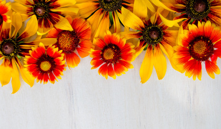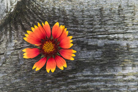 Background image of red and yellow flowers. Flowers on a background of old wood