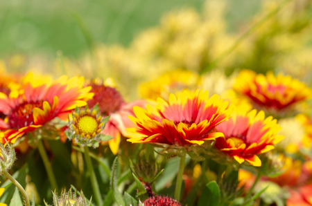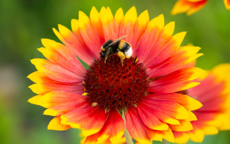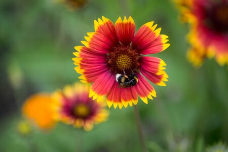 Red and yellow colorful flowers Gailardia in garden, pollination by bees, closeup