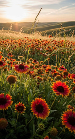 Beautiful flowers on the meadow at sunset in Tuscany, Italy
