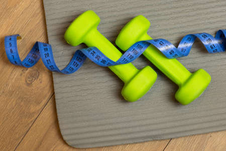 weightloss and exercise concet, fitness dumbbell set on yoga mat with measuring tape wrapped around them