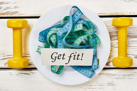 Dumbbells and measure tape lying on white wood background. Concept plan.