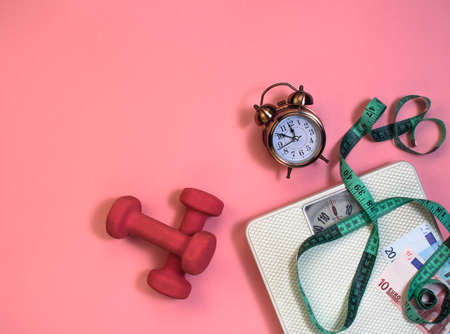 bathroom scales, alarm clock, banknotes, dumbbells and a centimeter, fitness at home - also requires material costs