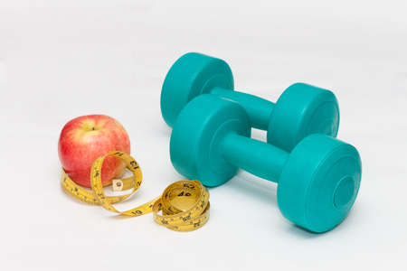 Blue fitness dumbbells with red apple and yellow tape isolated on white background