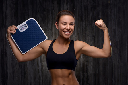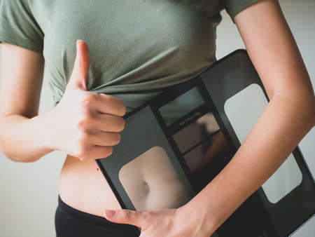 Slim sporty Woman holds weight scale and shows like or thumb up. People, sport, fitness and health concept. Selective focus.